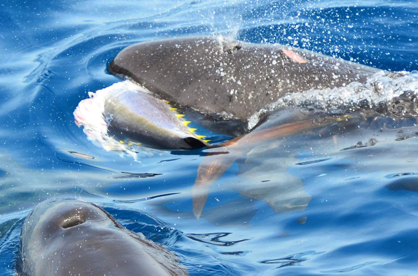 它們會追捕中大型魚類,在花蓮海域會獵食旗魚、鮪魚、鬼頭刀等,我們也在海域多次看到它們與鬼頭刀追逐的畫面,而且擅長集體作戰,可以看到大概10-20隻左右的偽虎鯨一起進行捕獵,也會與成員一起分享,雖然也曾有紀錄它們攻擊其他海豚,但它們發動攻擊大多是保護自己的族群,並不是像虎鯨一樣要狩獵。