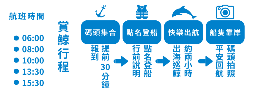 - 全程約2小時(依當時海況,鯨豚觀察情形適度調整)